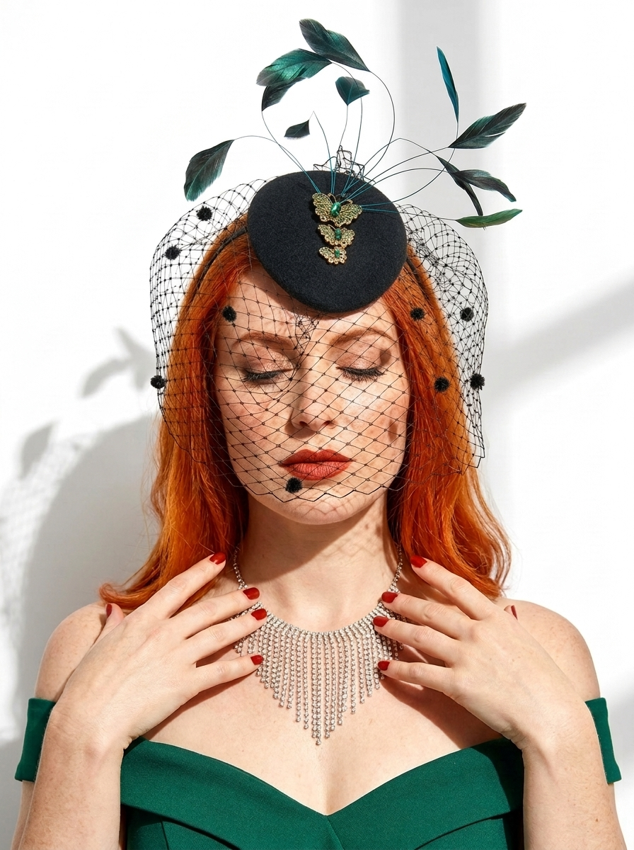 Черная вуалетка с зеленой брошью "бабочки"