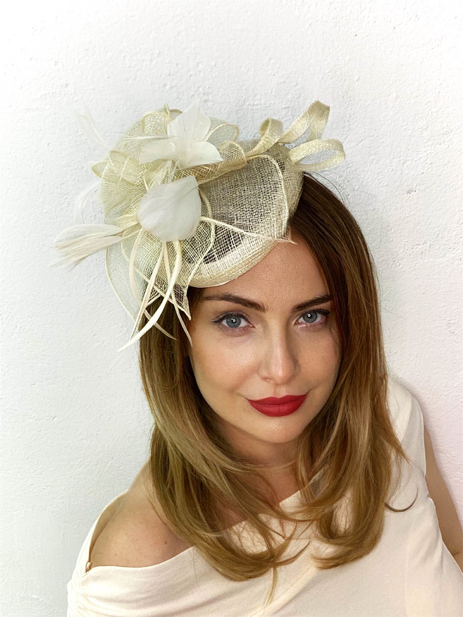 Шляпка таблетка из синамей ручной работы, крепится на ободок или заколку (в комплекте). Диаметр 15 см, высота 9см.